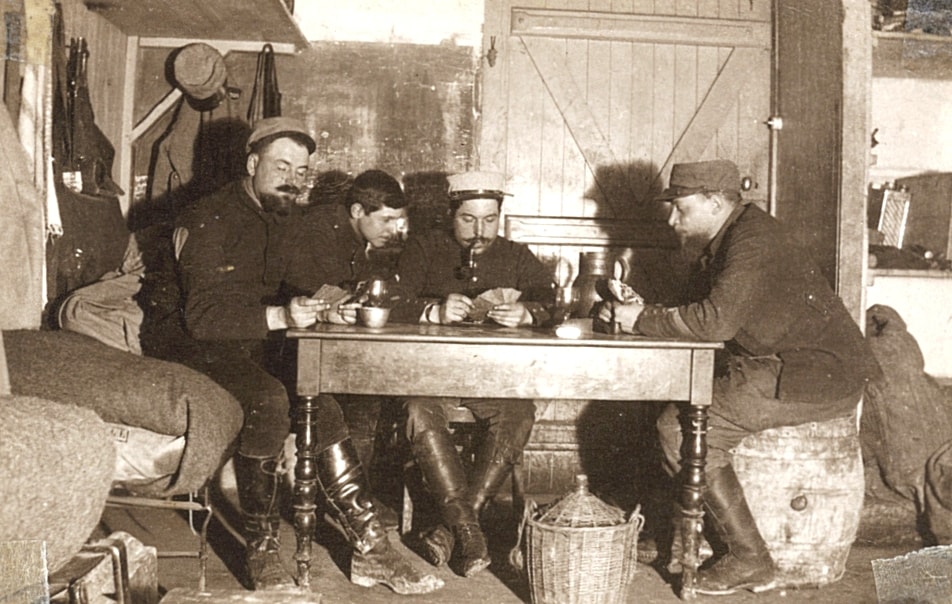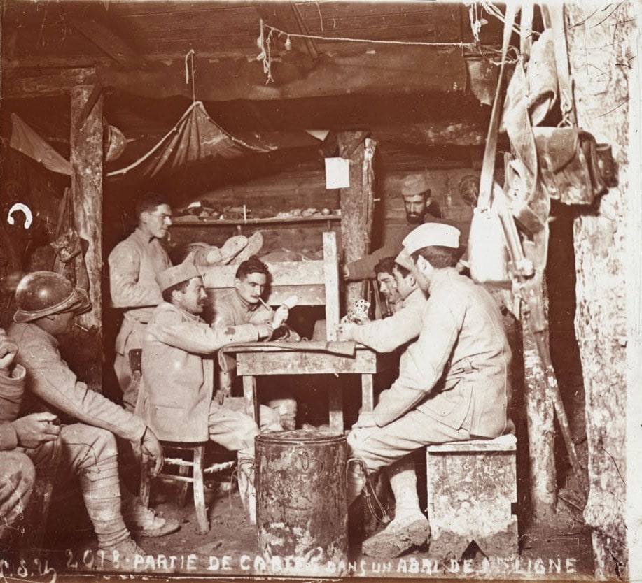 Partie de cartes dans un abri en 1ère ligne. Collection de plaques de verre stéréoscopiques de Maurice Brun, musicien au 89e RI. Sans date.