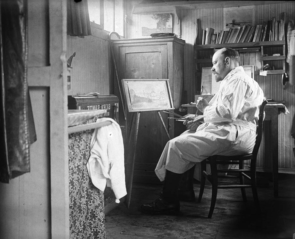 Un officier à son chevalet de peinture. Collection de plaques de verre stéréoscopiques du capitaine Henri de Gaudart d'Allaines, 74e RA. Sans date.