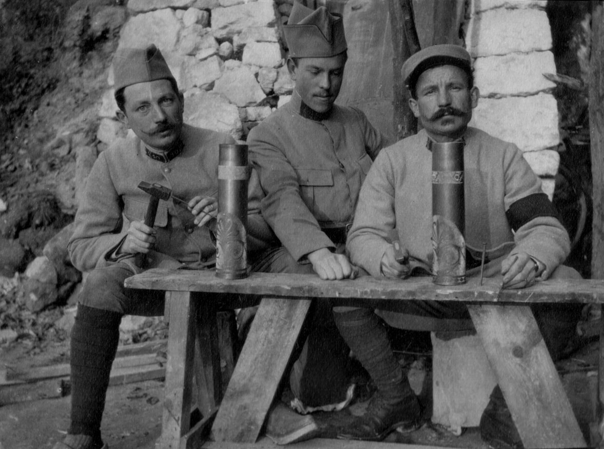 Atelier de gravure sur douilles d’obus. Photographie de Désiré Tilou. Sans date.