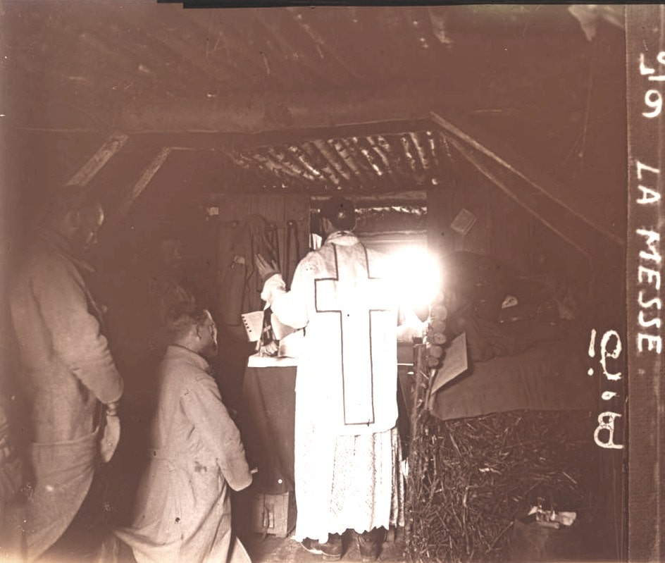 La messe dans un abri à la côte des Melons (Vimy, Pas-de-Calais). Collection de plaques de verre stéréoscopiques de Maurice Brun, musicien au 89e RI. Sans date.