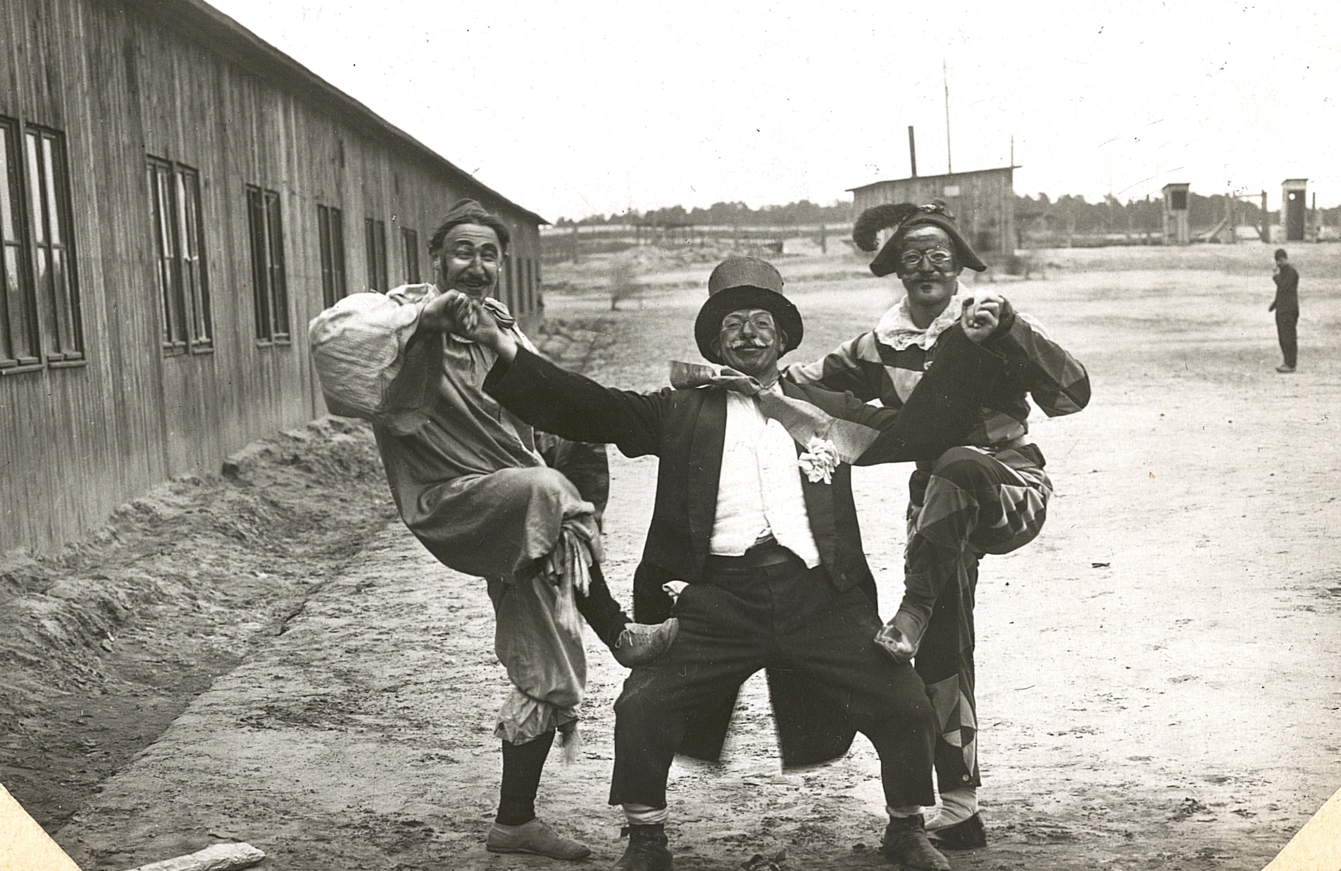 Jeux d’acteurs de prisonniers de guerre au camp de Schneidemühl (auj. Pila, Pologne). Album photographique de Paul Saintesprit. Sans date (1915-1918).