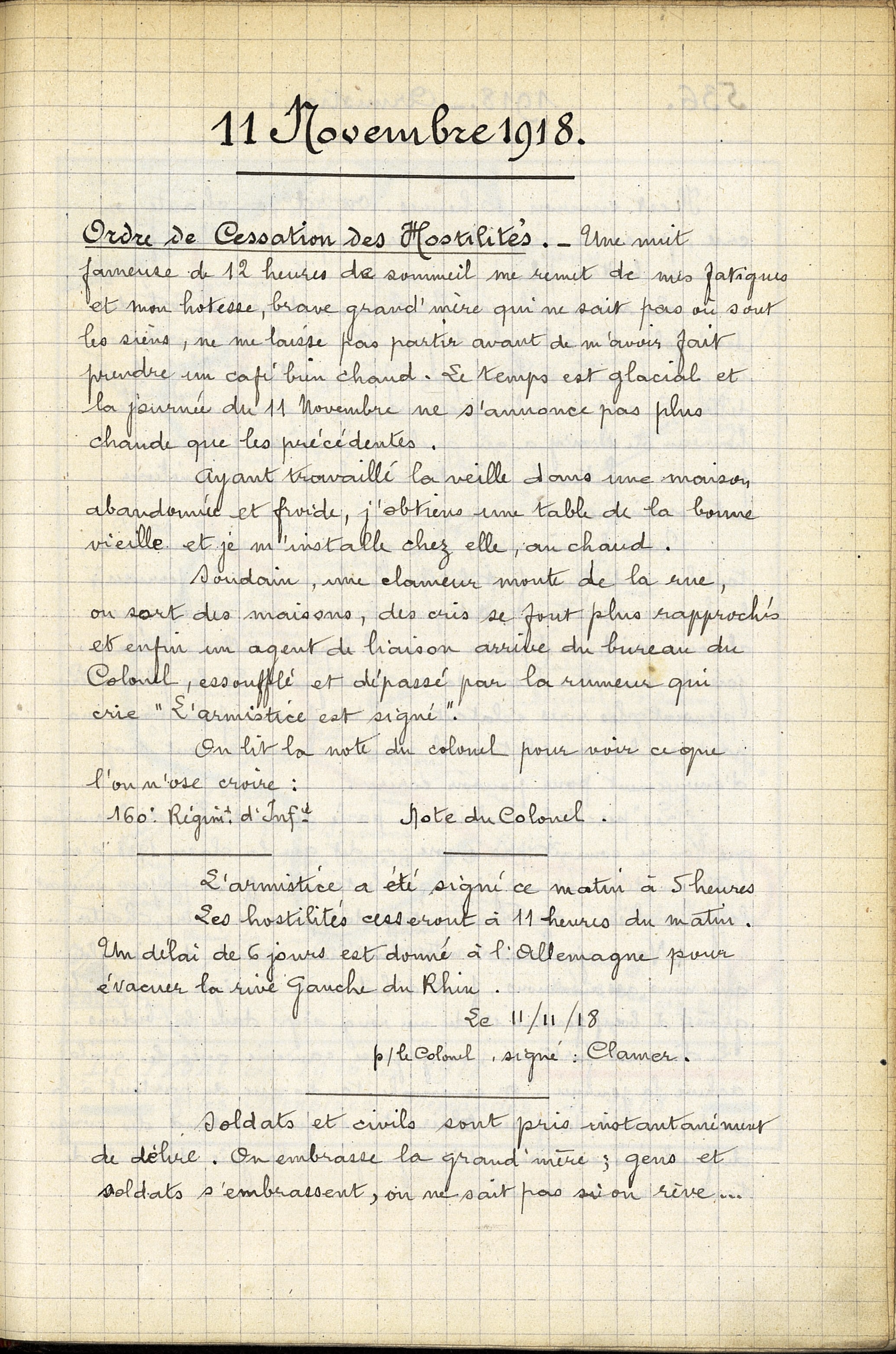 Carnet de « Souvenirs de guerre 1914-1919 » d’Albert Laborde, 160e RI, à la date du 11 novembre 1918.