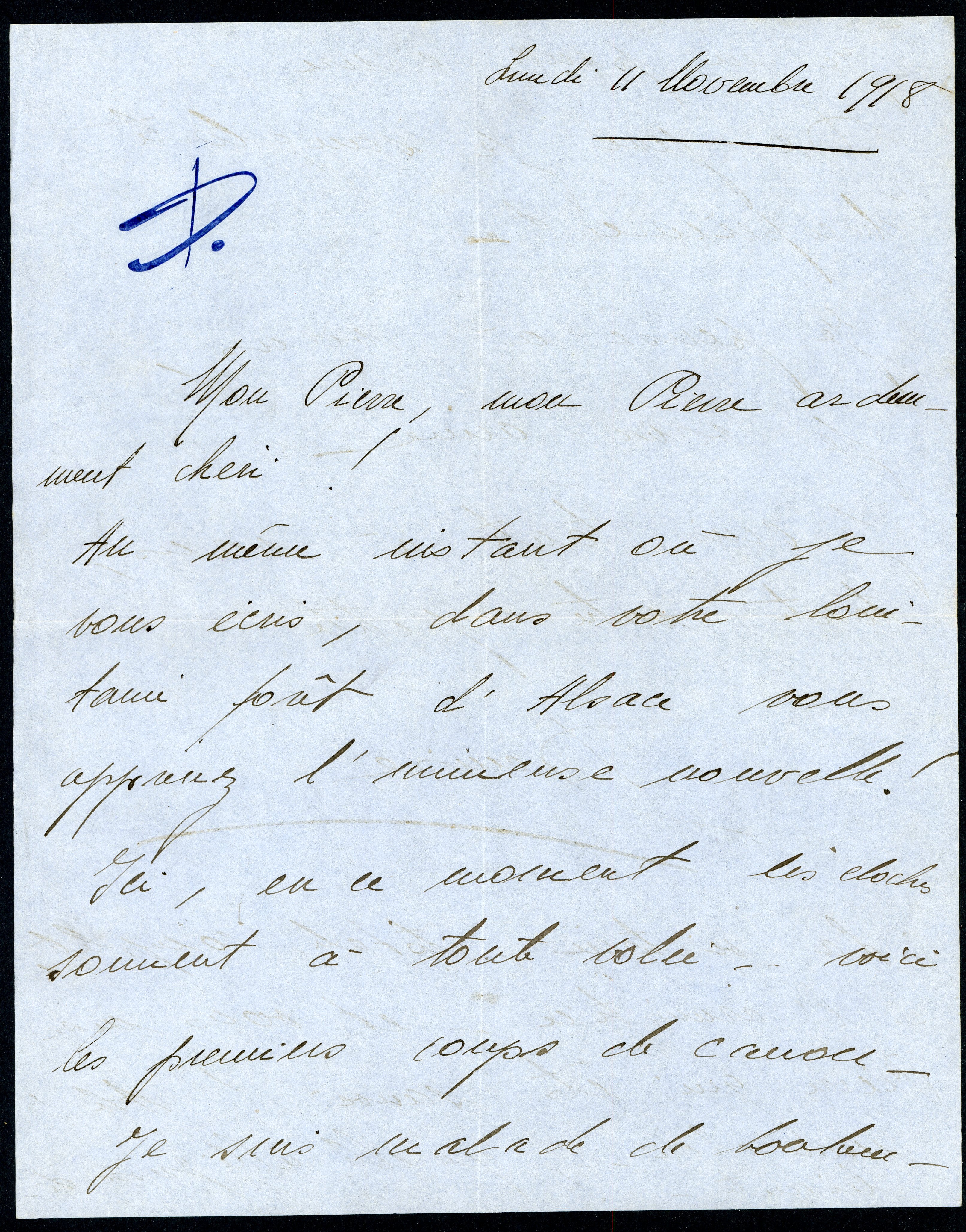 Lettre de Denise à son fiancé Pierre Fort, 13e RI. 11 novembre 1918.