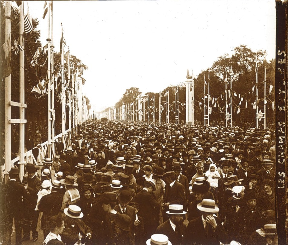 Défilé de la Victoire, la foule sur les Champs-Élysées à Paris. Collection de plaques de verre stéréoscopiques de Maurice Brun, musicien au 89e RI. 14 juillet 1919.