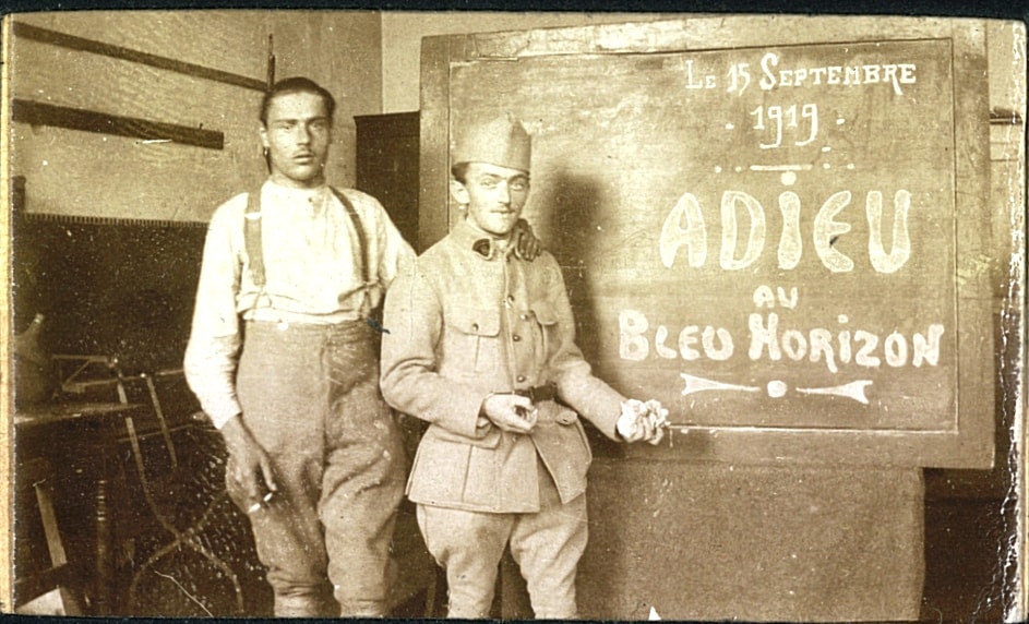 « Le 15 septembre 1919, adieu au bleu horizon » : photographie du soldat Camille Gayet à Wiesbaden envoyée à Léon Ballens, 2e Zouaves. Septembre 1919.