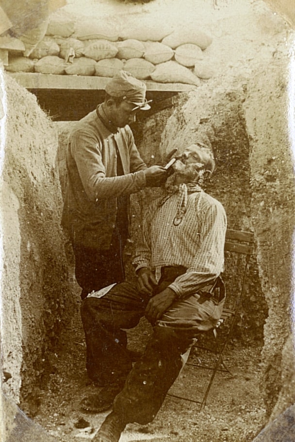 Le barbier à l’œuvre dans une tranchée. Album photographique de Paul Sourtiat. Sans date.