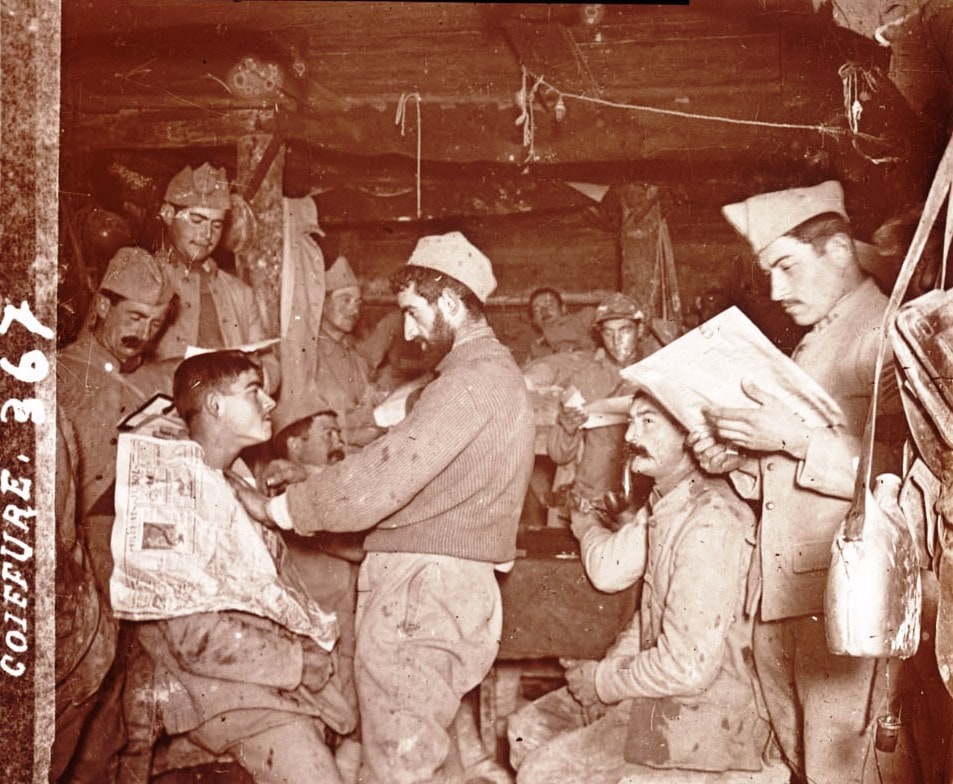 Le coiffeur. Collection de plaques de verre stéréoscopiques de Maurice Brun, musicien au 89e RI. Sans date.