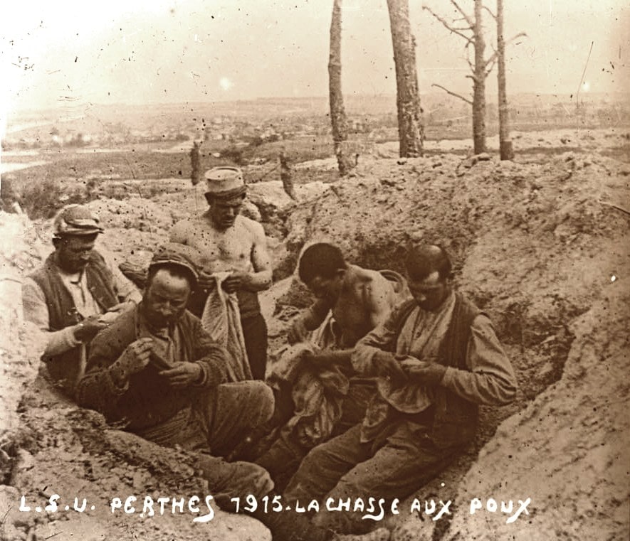 Chasse aux poux à Perthes-les-Hurlus (Marne). Collection de plaques de verre stéréoscopiques de Maurice Brun, musicien au 89e RI. 1915.